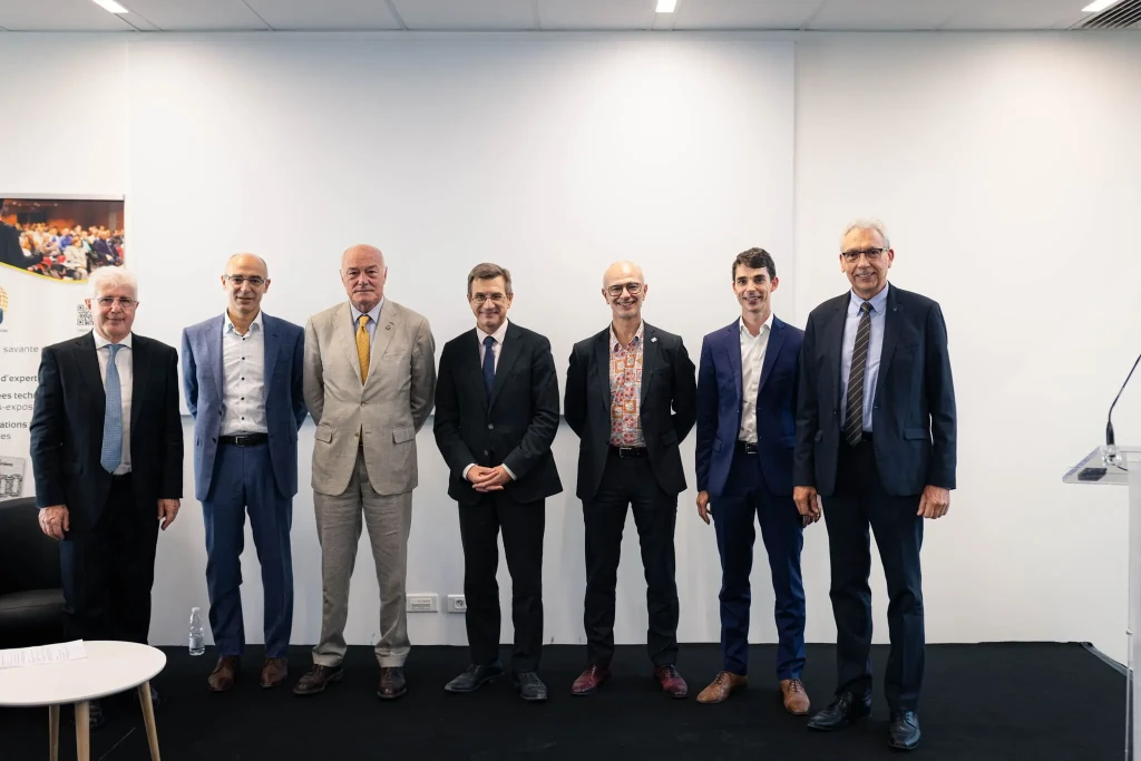 Les conférenciers de la séance inaugurale du 72e congrès-exposition de la Sim (de g. à d.) : Jean-Michel Négroni, président du congrès et secrétaire général de la Sim, Alessandro Dazza, directeur général d’Imerys, Alain Rousset, président de la région Nouvelle-Aquitaine, Benjamin Gallezot, délégué interministériel aux approvisionnements en minerais et métaux stratégiques, Stéphane Bourg, directeur de l’Observatoire français des ressources minérales, Gaétan Lefebvre, ingénieur géologue expert en intelligence minérale au BRGM, Thierry Meilland-Rey, président de la Sim. © Sim/JPMR