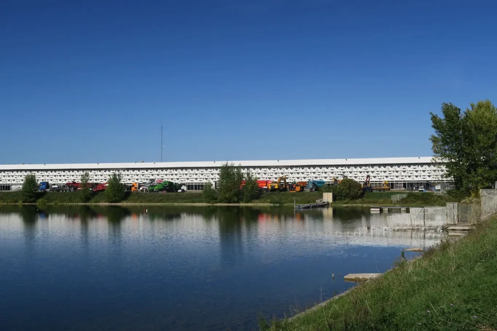 Le soleil se lève sur le quartier de Bordeaux Lac et l’exposition extérieure. Sur 5 000 m², 28 grosses machines et 10 petits équipements étaient présentés aux visiteurs. © Sim/JPMR